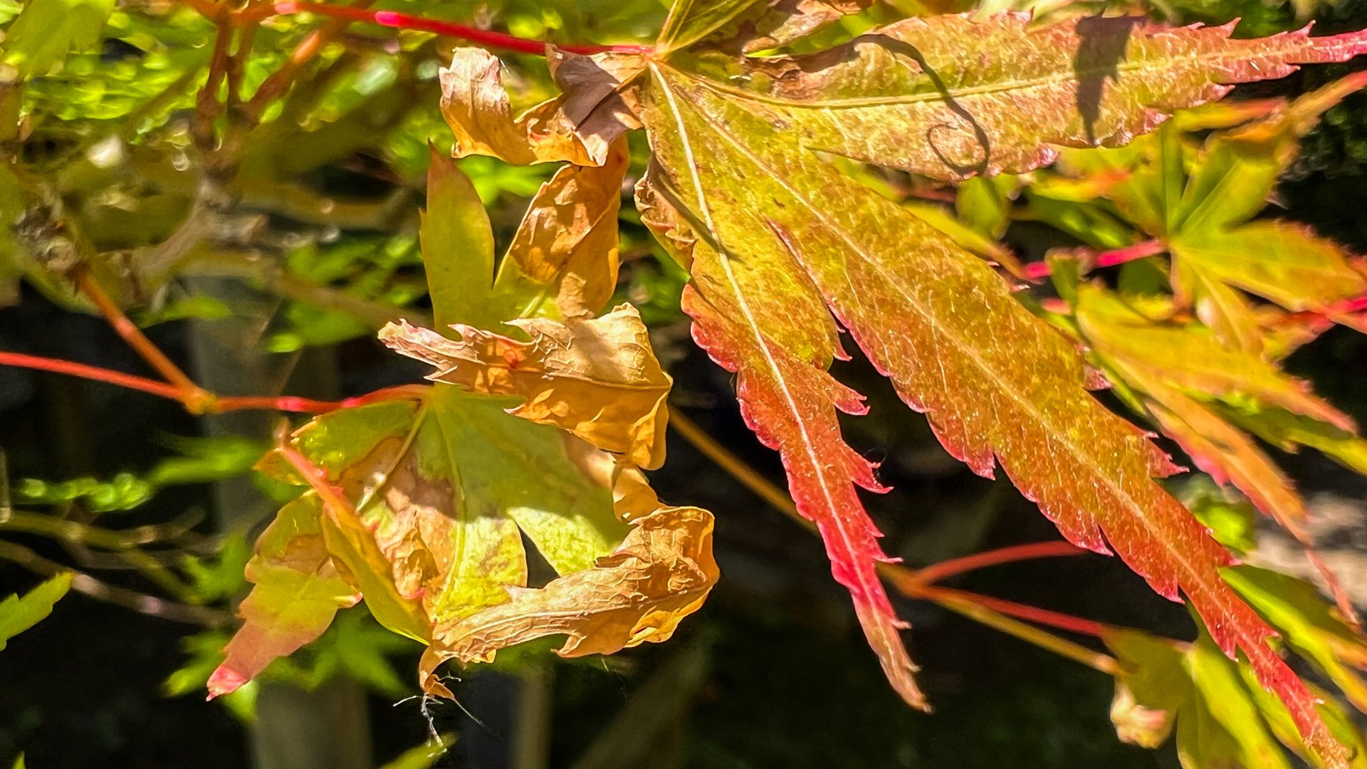 Feuille d’érable du Japon desséchée par le vent à côté d’une qui a résisté.