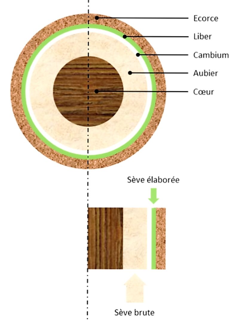 Le cambium, élément actif de la croissance de l'arbre, crée de l'aubier vers l'intérieur du tronc et du liber vers l'extérieur.